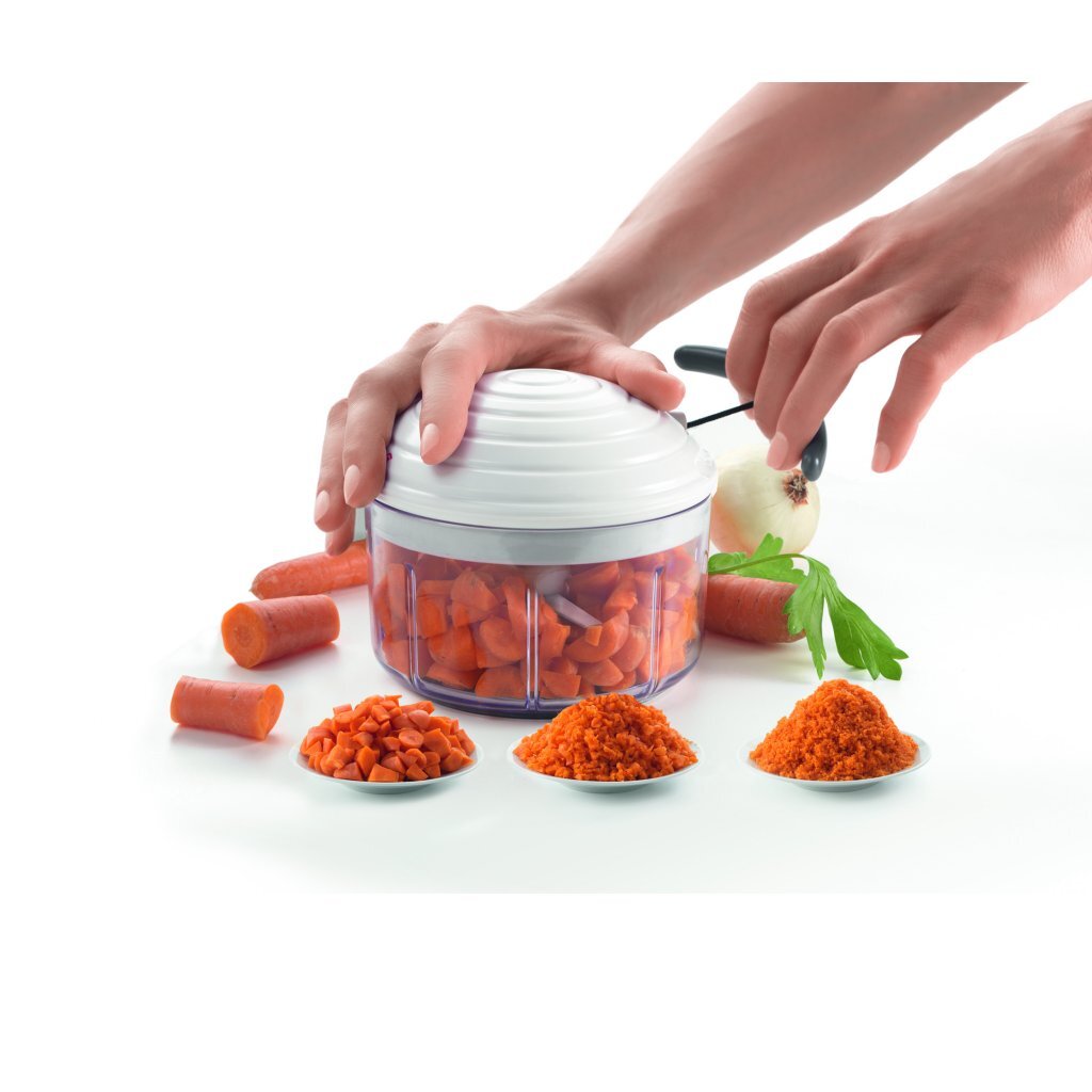 De Metaltex Rotomac revolutionaire groentehakkeris een multitalent keukenmachine die geen stroom hodig heeft. Ze wordt door een trektouw aangedreven. De Rotomac snijdt vruchten, roodten van grof tot fijn en mengt sauzen, sapen, soepen. Alle onderdelen, behalve het deksel met het trekmechanisme, zijn vaatwasbestendig.