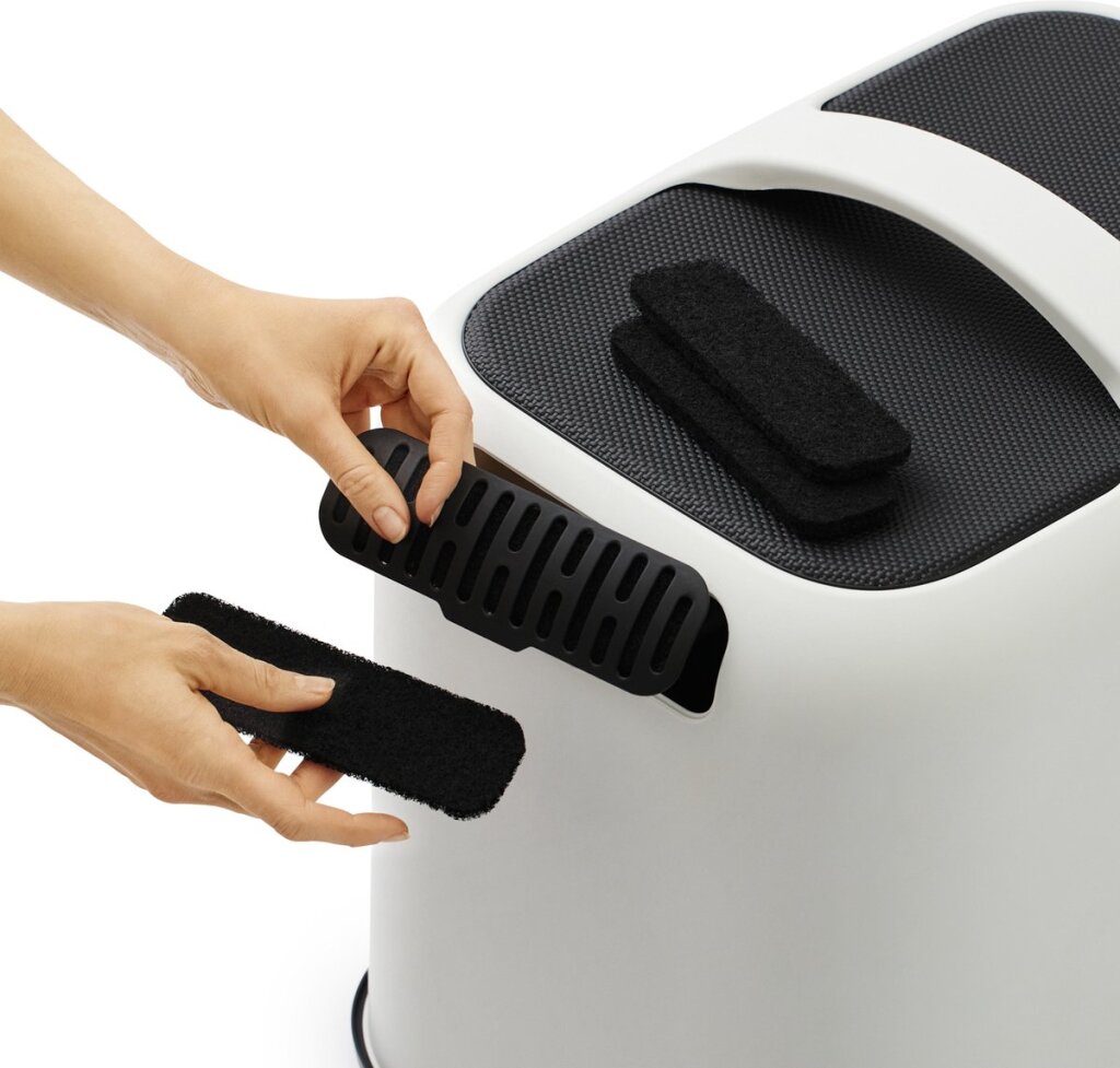 De filters zijn gemakkelijk te vervangen. Aan de achterkant van de kattenbak zit een rooster die je gemakkelijk los kunt halen. In dit rooster bevind zich de filter. Deze kun je er gemakkelijk uithalen en een nieuwe erin schuiven.