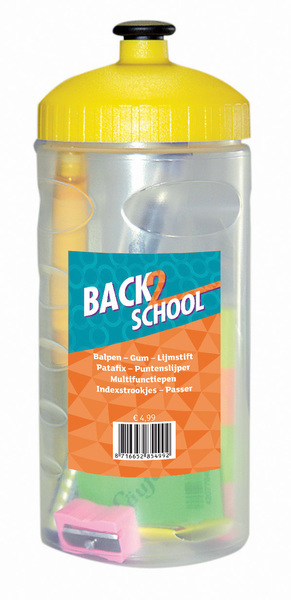 Drinkbeker gevuld met de volgende artikelen: Balpen Schneider Slider XB, Laufer gum, lijmstift, Patafix, puntenslijper, multifunctionele pen, indexeringsstrookjes, passer.