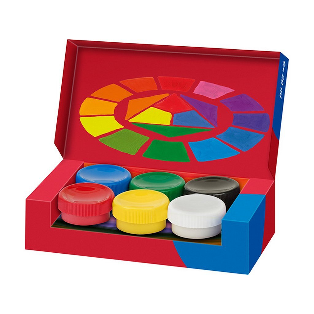 Gebruiksklare, in water oplosbare tempera-kleuren voor kinderdagverblijven, scholen en vrije tijd. Deze sterk gepigmenteerde dekkende kleuren zijn geschikt voor een breed scala aan schilder- en mengtechnieken. Voor bijna alle ondergronden. Deze verf is bijzonder kleurintensief en lichtecht. Inhoud: 6 potten a 20 ml met schroefdop (rood, blauw, groen, geel, wit en zwart).