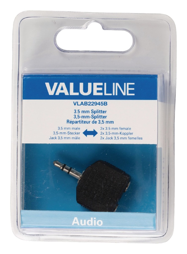 Deze splitter is geschikt voor het aansluiten van twee 3,5 mm stereo audiokabels op een enkele 3,5 mm uitgang.