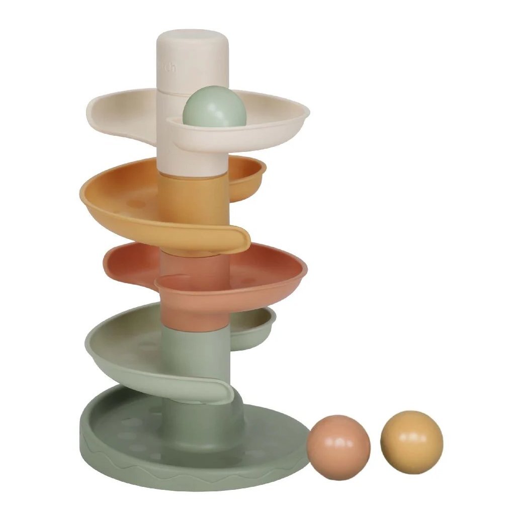 Laat de bal maar rollen! De spiraaltoren van Little Dutch zorgt voor eindeloos veel speelplezier. Deze kleurrijke set bestaat uit 5 subtiel gekleurde delen die jouw kleintje gemakkelijk op elkaar stapelt. Laat de ballen een voor een op de bovenste laag vallen en kijk hoe ze achter elkaar naar beneden rollen en slingeren. De spiraaltoren draagt bij aan de ontwikkeling van de hand-oog coördinatie en leert kleintjes over oorzaak en gevolg, waarmee het zowel leuk als leerzaam spelen is. Bij de spiraaltoren zitten standaard 3 lichte en gemakkelijk vast te pakken ballen in verschillende kleuren die bij beweging een geluidje maken. Dit speelgoed is uitgevoerd in de kenmerkende Little Dutch kleuren oudroze, roze, lichtroze, groen en okergeel. De afmeting is: 18 x 18 x 30 cm. Geschikt voor kinderen vanaf 10 maanden.